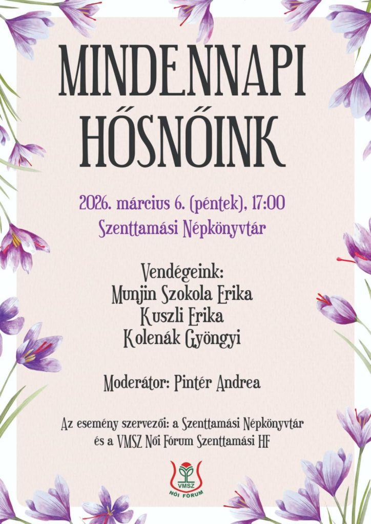 A Vajdasági Magyar Szövetség szenttamási szervezetének Női Fóruma és a Szenttamási Népkönyvtár szervezésében március 6-án (péntek) 17 órai kezdettel kerül megrendezésre a Mindennapi Hősnők nevet viselő beszélgetős műsort. A rendezvényre a Szenttamási Népkönyvtárban kerül sor. A műsort azzal a szándékkal hívják életre, hogy bemutassák azokat a hölgyeket, akik nap mint nap, a reflektorfényt kerülve végzik munkájukat és küldetésüket. Édesanyaként, pedagógusként, nyugdíjasként, pályázatíróként, vagy éppen önkéntesként élik hétköznapjainkat, miközben a közösségért dolgoznak, időt és fáradságot nem kímélve. Az est meghívott vendégei: Munjin Szokola Erika, a Jovan Jovanović Zmaj Általános Iskola igazgatója, Kuszli Erika, bejegyzett mezőgazdasági termelő és Kolenák Gyöngyi, vállalkozó. A beszélgetést Pintér Andrea, a könyvtár igazgatója vezeti.