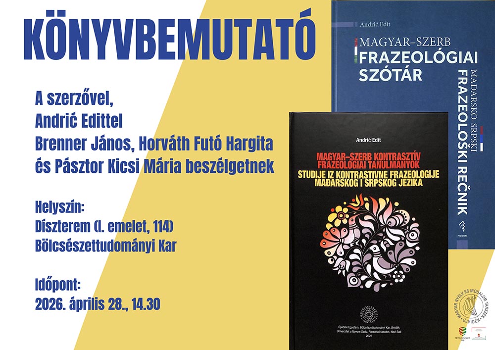 Andrić Edit Magyar–szerb frazeológiai szótárának, valamint a Magyar–szerb kontrasztív frazeológiai tanulmányok című könyvének bemutatója április 28-án, kedden kerül megrendezésre a Bölcsészettudományi Kar dísztermében (I. emelet, 114-es terem), szerb és magyar nyelven.