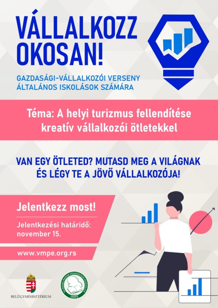 A Vajdasági Magyar Pedagógusok Egyesülete nyolcadik alkalommal hirdeti meg a Vállalkozz okosan! diákversenyt az általános iskolás tanulók számára gazdasági- vállalkozói témakörben.