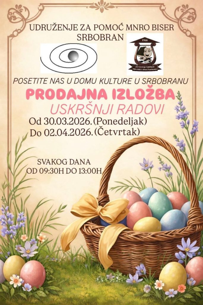 A szenttamási Kultúrotthon értesíti a polgárokat, hogy a Gyöngy, a Fejlődésben Elmaradt Személyek Egyesületének húsvéti kiállítása március 30-ától (hétfő) április 2-ig látogatható a Kultúrotthon galériájában.