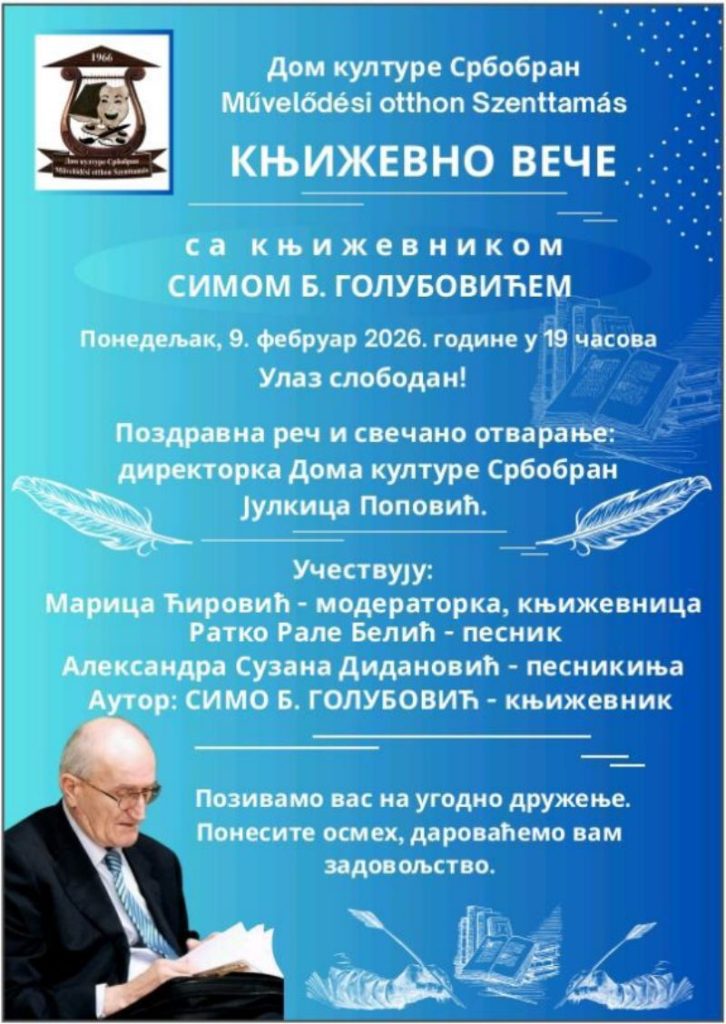 A szenttamási Kultúrotthon szeretettel meghívja Önöket Sima B. Golubović neves író irodalmi estjére, amelyre február 9-én (hétfő), 19 órakor kerül sor a Kultúrotthon galériájában.