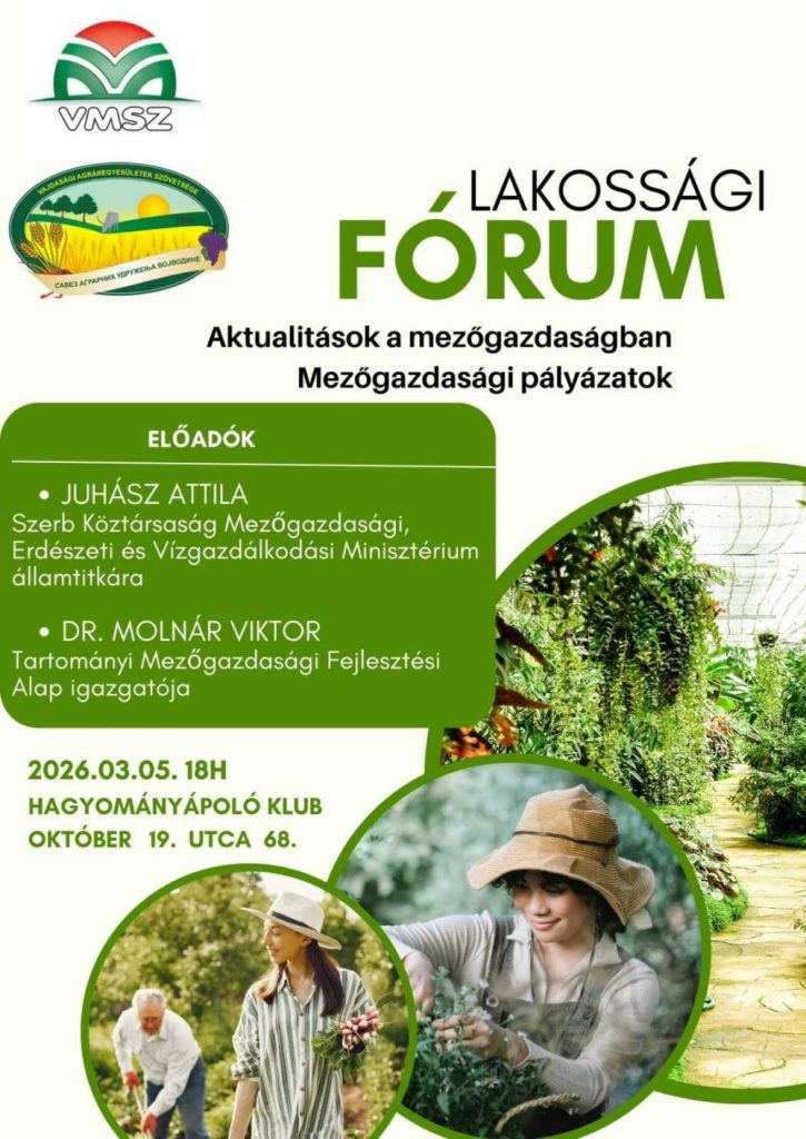 Mezőgazdasági lakossági fórumot tartanak a Vajdasági Magyar Szövetség és a Vajdasági Agráregyesületek Szövetségének szervezésében csütörtökön, (március 5.) 18 órakor a Hagyományápoló Klub termében (október 19-e utca 68.). Az érdeklődő gazdákat Juhász Attila, a Szerb Köztársaság Mezőgazdasági, Erdészeti és Vízgazdálkodási Minisztériumának államtitkára és dr. Molnár Viktor, a Tartományi Mezőgazdaság-fejlesztési Alap igazgatója a mezőgazdasággal kapcsolatos aktualitásokról tájékoztatja a gazdákat.