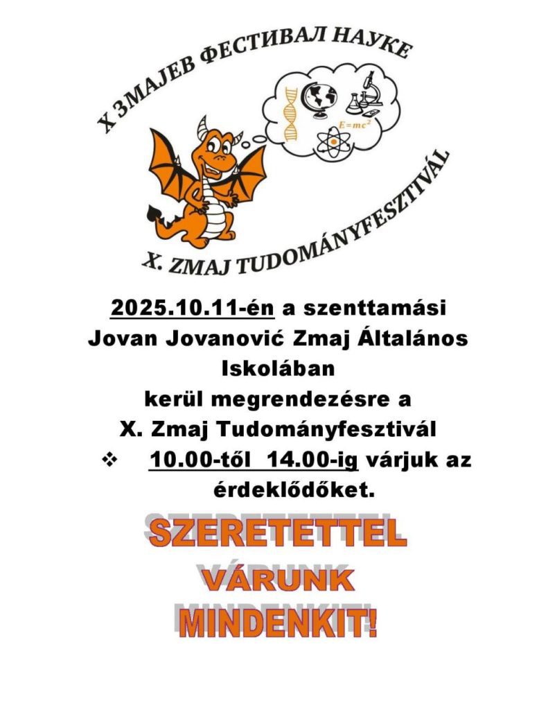 A szenttamási Jovan Jovanović Zmaj Általános Iskola előcsarnokában 2025. október 11-én (szombat) délelőtt 10 órától kerül sor a jubiláris, 10. Zmaj Tudományfesztiválra. Az eseményre a szervezők idén várják az az Újvidéki Egyetem Magyar Nyelv és Irodalom Tanszék hallgatóit, az Újvidéki Mezőgazdasági Kar hallgatóit, akik tudományos installációkkal  és bemutatókkal érkeznek, a törökbecsei középiskola fiatal kutatói kreatív kísérleteket mutatnak be, a helyi  Vuk Karadžić Általános Iskolából tudós lányok érkeznek, akik bűnügyi rejtélyeket derítenek ki, a verbászi Október 20. Általános Iskola diákjai matematikai fejtörőket hoznak, a karlócai Október 23. Általános Iskola tanulói pedig interaktív matematikai játékokkal várják az érdeklődőket.
