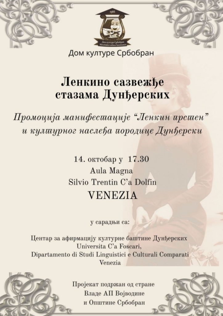 A Kultúrotthon velencei partnerei a Ca’ Foscari Egyetem Nyelvészeti és Kulturális Összehasonlító Tanszék, valamint a Dunđerski Kulturális Örökség Őrzésének Központja, ezért a program az ottani egyetem egyik legszebb termében kerül majd megrendezésre.
